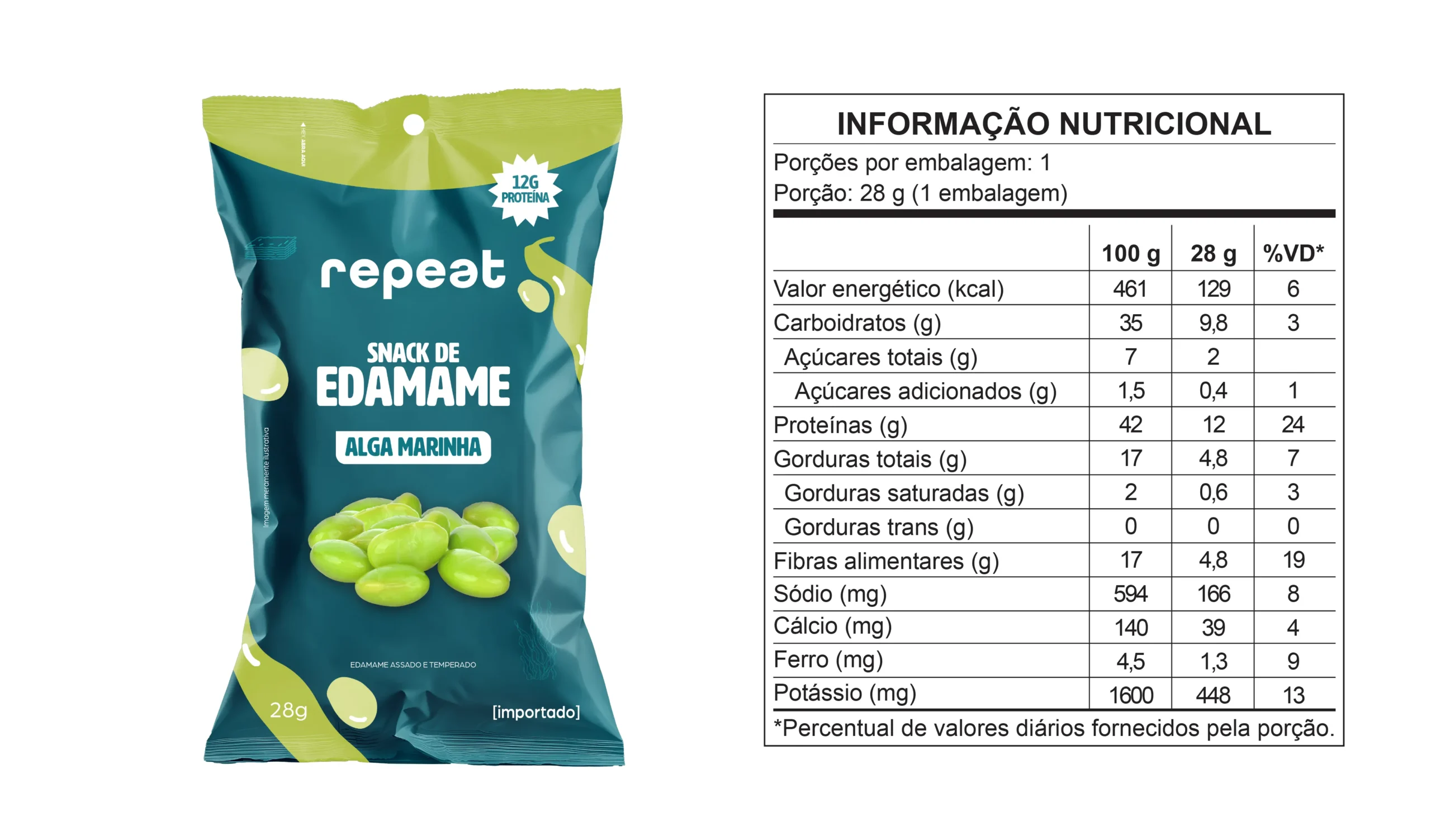 - INGREDIENTES: Edamame, tempero de alga marinha (açúcar, alga marinha, sal, glucose, glutamato monossódico, proteína vegetal hidrolisada em pó, óleo de palma, realçadores de sabor nosinato dissódico e guanilato dissódico, dióxido de silício e aspartame), óleo de girassol e sal.